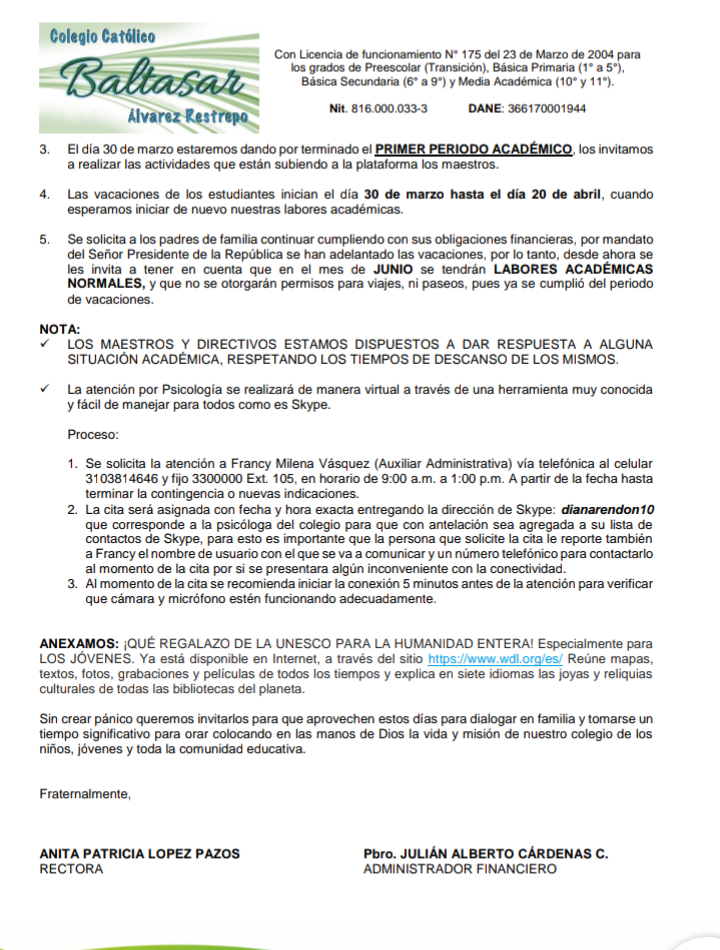 Si hay alguna duda, inquietud, pregunta, no dude en consultarme a través de este blog, el correo electrónico: andriu238@hotmail.com o por medio de la representante de los padres de familia, quién ha estado muy dispuesta a brindar apoyo en esta situación que enfrentamos.