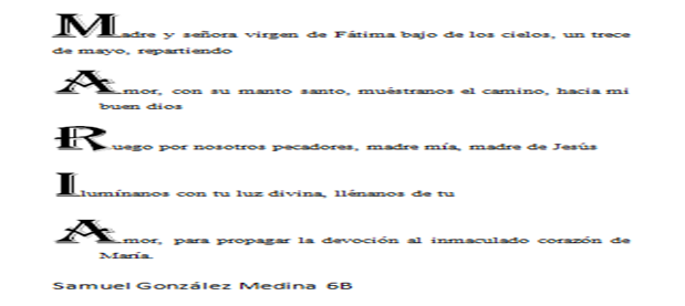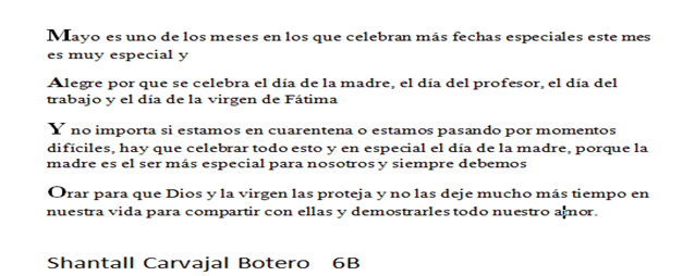 Nuestra oración hoy la haremos para finalizar el mes de mayo con la lectura de unos acrósticos elaborados por algunos estudiantes del colegio.