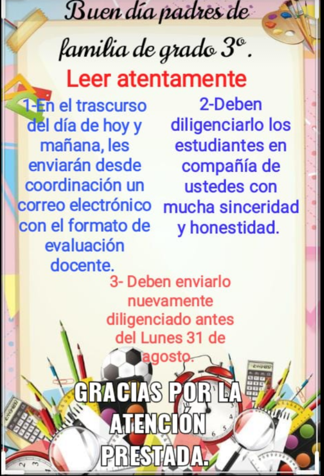 | 12:30 1:30 PM | RELIGIÓN Y ETICA TERMINO MIS ACTIVIDADES | 1:00 PM – ATENCIÓN A PADRES https://us04web.zoom.us/j/79322160662?pwd=eEVMRlJLOFFNdHFIcWRBZG5OY0paZz09 ID de reunión: 793 2216 0662 Código de acceso: ATENCION3B | ESPAÑOL (11:45 AM) https://us04web.zoom.us/j/79466303436?pwd=SS9uMHYzVVdZcW4rNXRlUk52end0dz09 ID de reunión: 794 6630 3436 Código de acceso: ESPANOL | ED. FÍSICA | HORA LIBRE |
