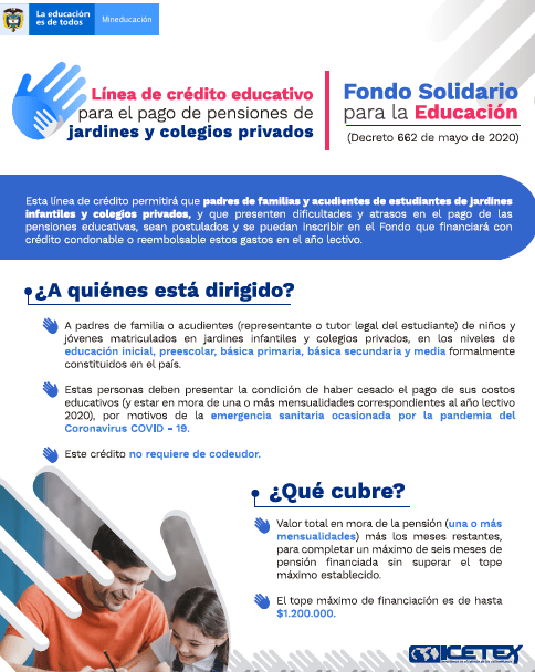 Buenos días, el Ministerio de Educación abrió convocatoria para que las familias puedan financiar el pago de la pensiones atrasadas en colegios privados; esta línea permitirá la finalización de pensiones hasta por 6 meses y cubre un monto máximo de $1.200.000 por estudiante. Para aplicar a esta línea el colegio debe postular al Padre de familia como potencial beneficiario.