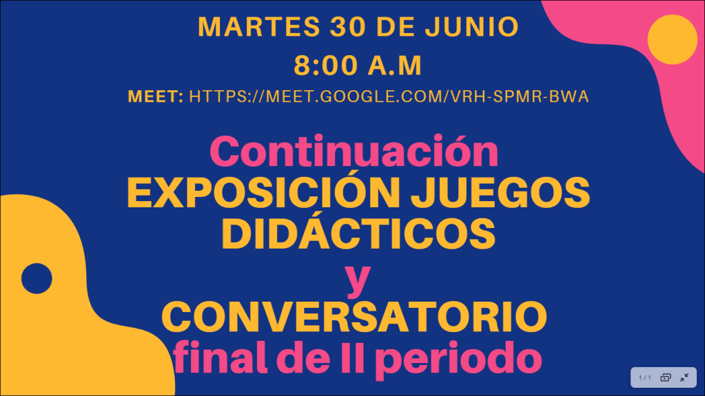 NOS VEMOS NUEVAMENTE EL VIERNES A LAS 9:00 a.m, https://meet.google.com/vrh-spmr-bwa ESTE DÍA PINTA-CARITAS Y EXPOSICIÓN DE JUEGOS DIDÁCTICOS.